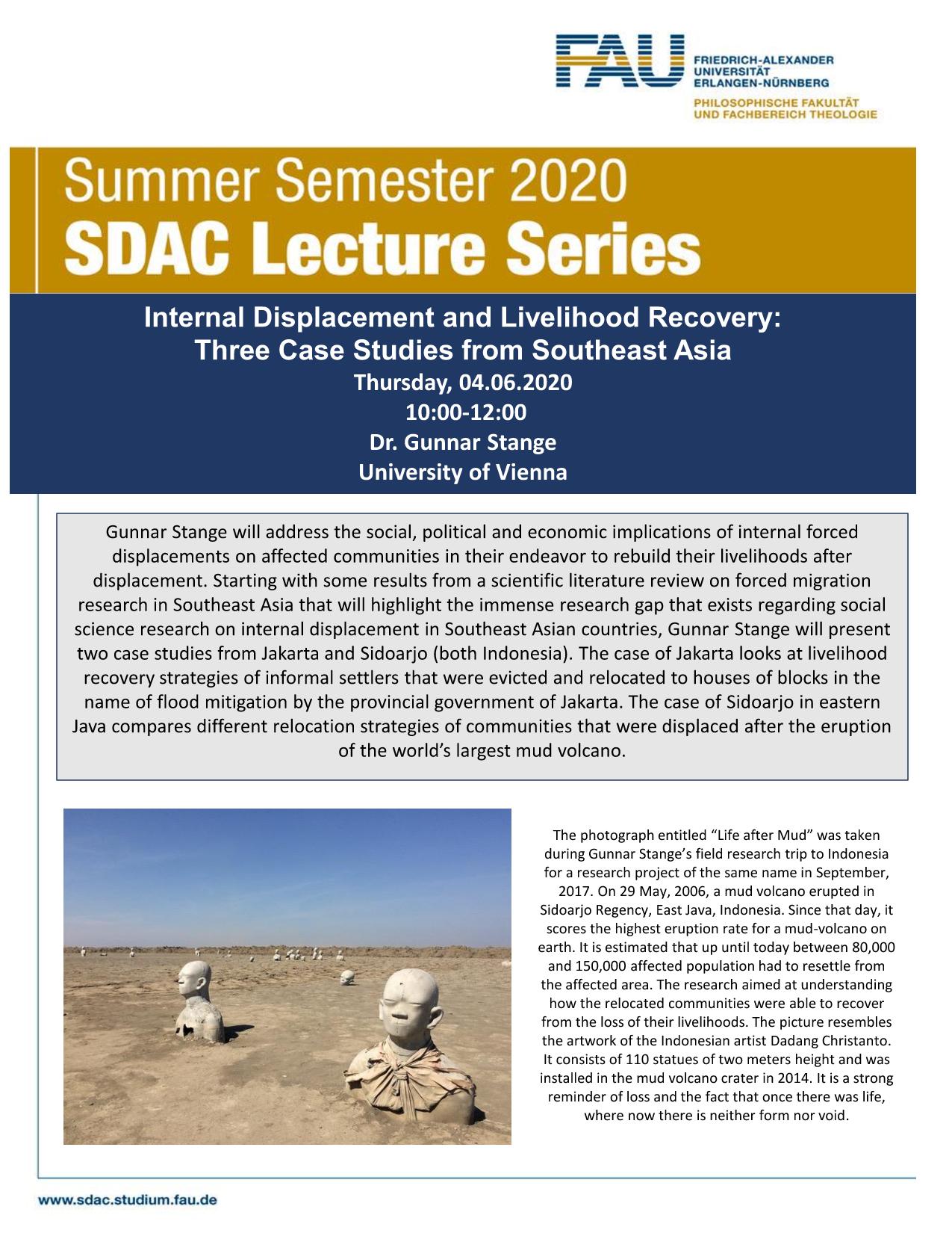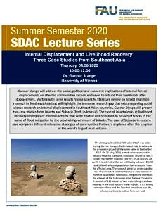 Dr. Gunnar Stange (University of Vienna) will speak on “Internal Displacement and Livelihood Recovery: Three Case Studies from Southeast Asia” and