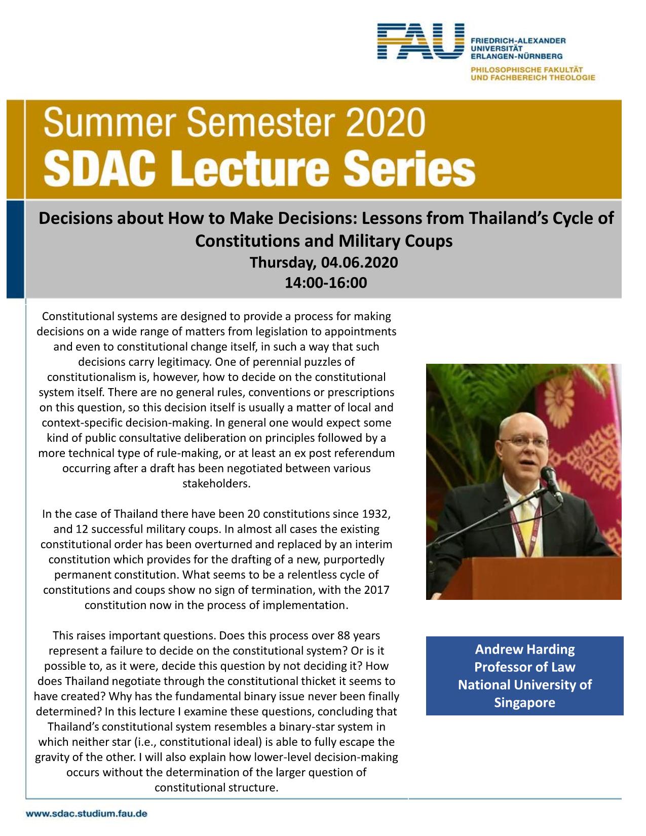 Prof. Andrew Harding (University of Singapure) will hold a talk about “Decisions about How to Make Decisions: Lessons from Thailand’s Cycle of Constitutions and Military Coups”.