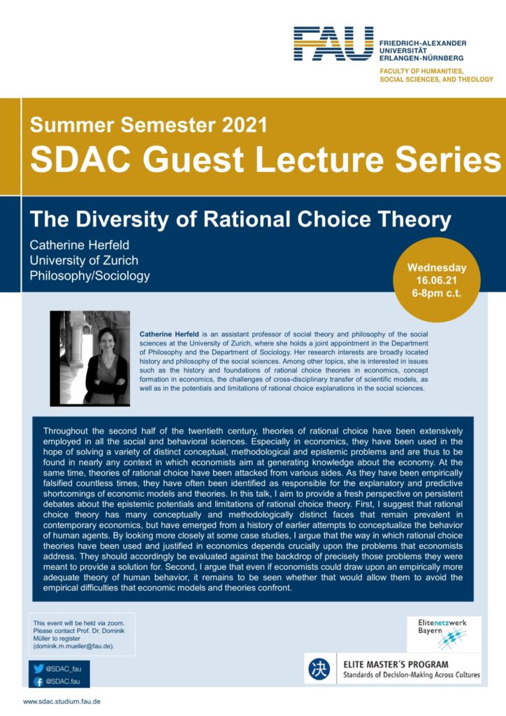 For this week’s SDAC Guest Lecture Series, we are looking forward to hearing from Catherine Herfeld, and her topic is “The Diversity of Rational Choice Theory.”