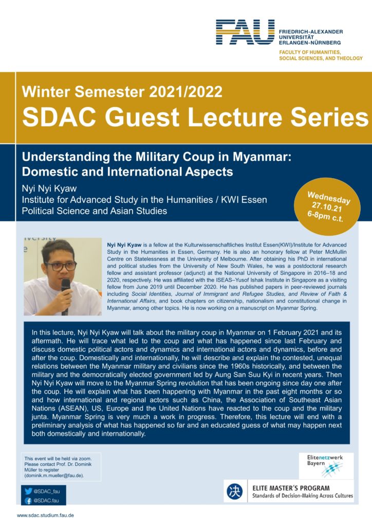 We are excited to announce that our first SDAC Guest Lecture for the winter semester 2021/2022 will take place this week! In this lecture, Nyi Nyi Kyaw will talk about “Understanding the Military Coup in Myanmar: Domestic and International Aspects.”