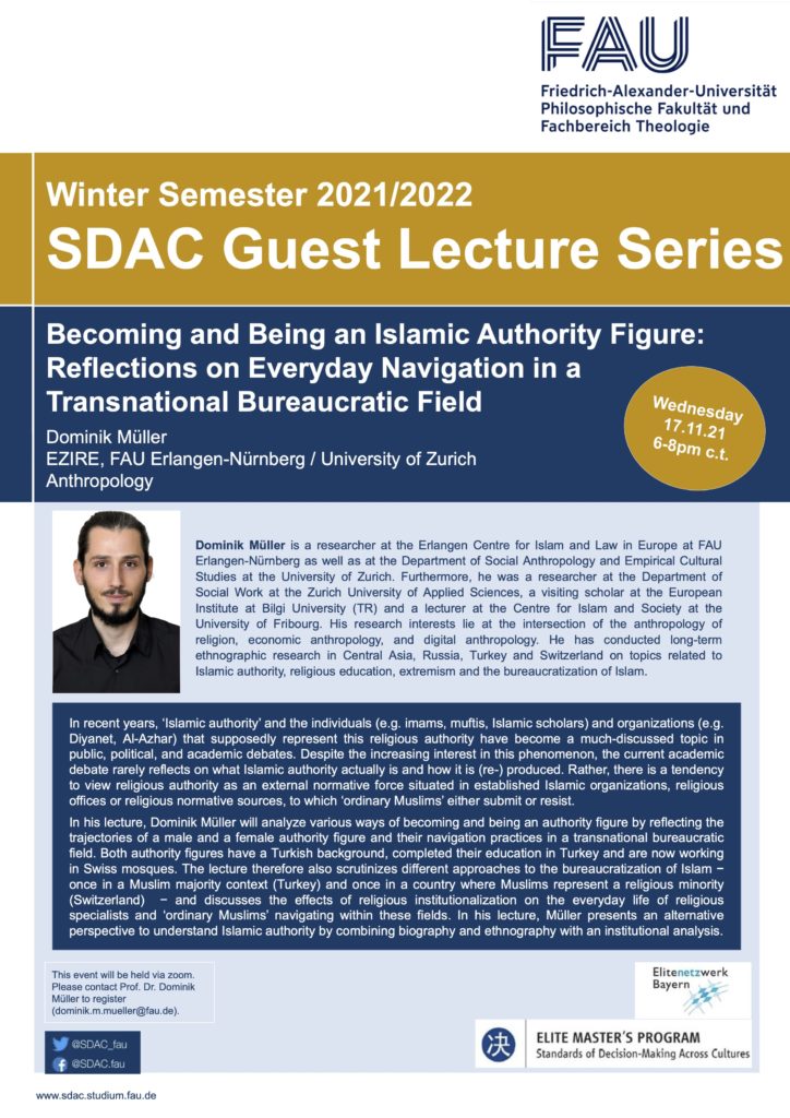 This Wednesday, we welcome Dominik Müller as our SDAC guest lecturer. His topic is “Becoming and Being an Islamic Authority Figure: Reflections on Everyday Navigation in a Transnational Bureaucratic Field.”