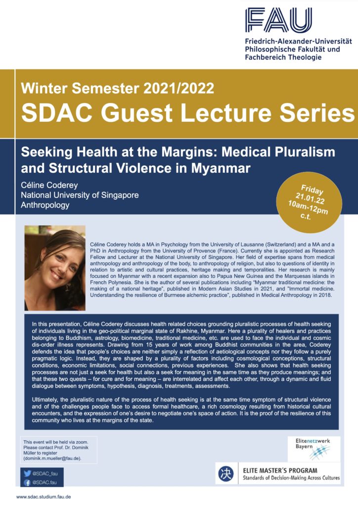 This week’s Guest Lecture Series features Céline Coderey, Research Fellow and Lecturer at the National University of Singapore. Her topic is “Seeking Health at the Margins: Medical Pluralism and Structural Violence in Myanmar.“