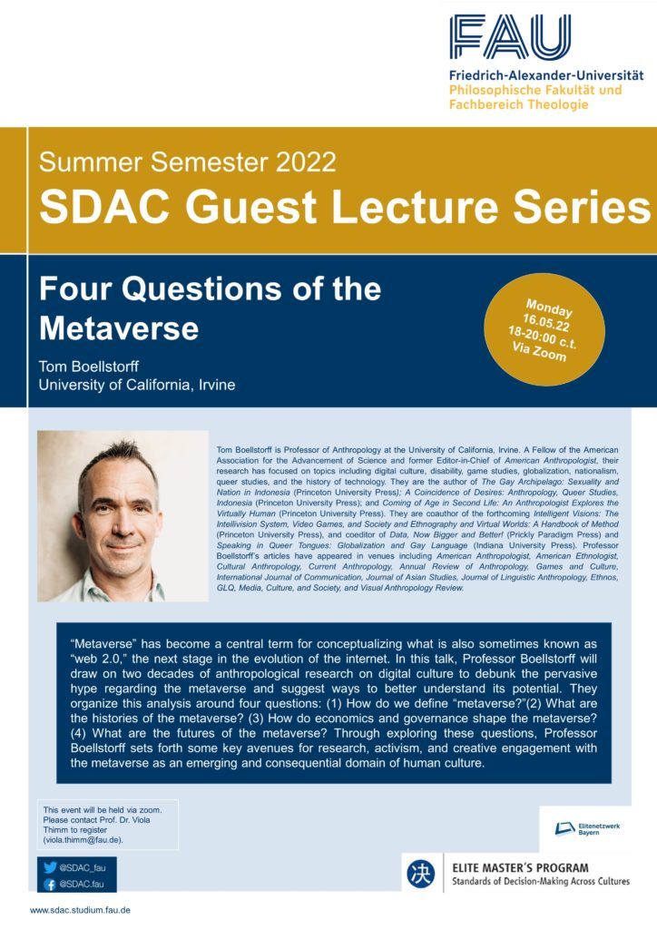 Next Monday, we welcome Tom Boellstorff, Professor of Anthropology at the University of California, Irvine. Their topic is “Four Questions of the Metaverse”