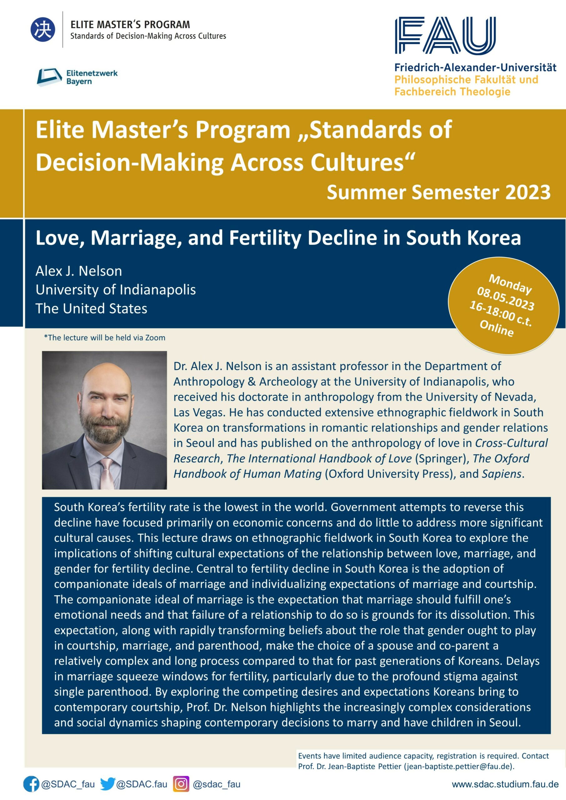 Our next guest lecturer is Dr. Alex J. Nelson, an assistant professor in the departement of Anthropology & Archeology at the University of Indianapolis. He will talk about the declining fertility rates in South Korea and how it´s influnced by the shifting cultural expectations of the relationship between love, marriage, and gender. The lecture will be held in the building at Kochstraße 4, in room 2.058 and via Zoom, on Monday, May 8th, 4-6 pm (c.t.).