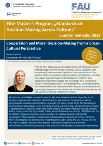 Our next guest lecturer is Dr. Anni Kajanus, an assistant professor of social and cultural anthropology at the University of Helsinki. She will talk about how morals and moral systems impact decision-making processes across cultural and historical landscapes. Due to the Deutsche Bahn strike the lecture will be held over Zoom, on Monday, May 8th, 4-6 pm (c.t.).