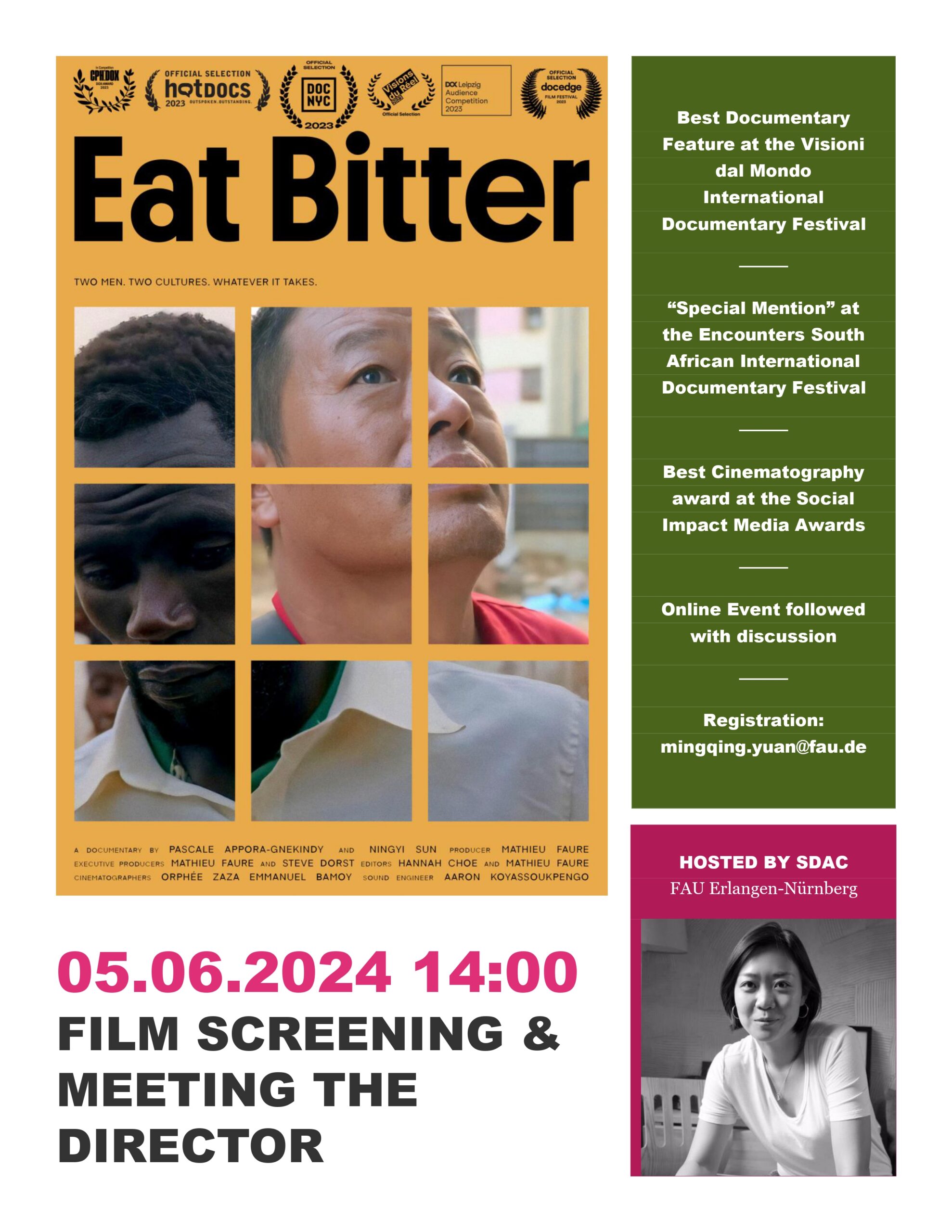 Our faculty member Mingqing Yuan invites to the online film screening and post-screening discussion with the director Ningyi Sun. The documentary is called Eat Bitter (2023) and is centered on Central Africa and China. It asks the age-old question of what we are prepared to sacrifice for a better tomorrow, without a promise that will ever arrive. The film has been listed in several documentary film festivals.